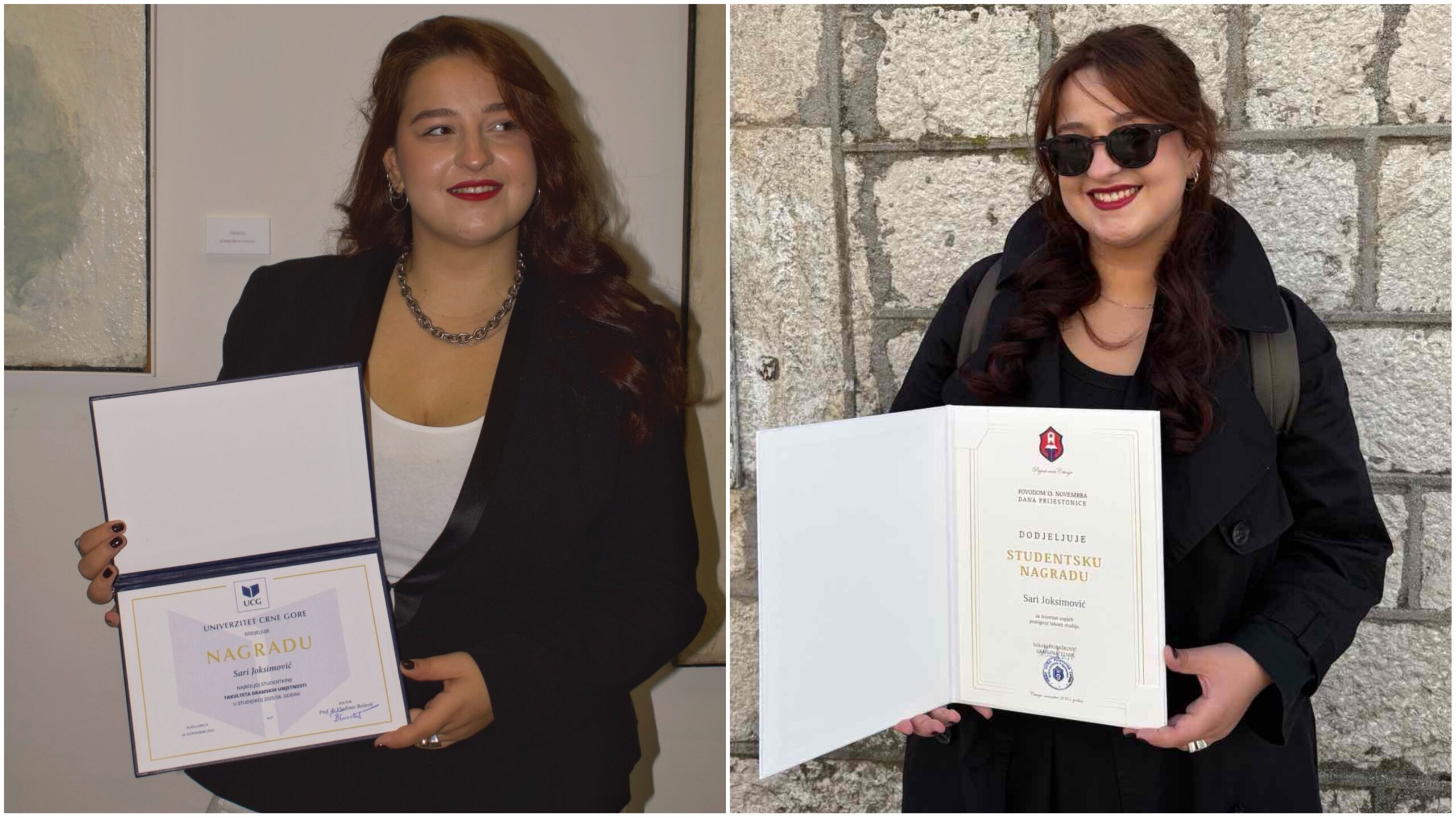 Studentkinja Fakulteta dramskih umjetnosti, Sara Joksimović iz Berana ove godine je dobitnica dvije nagrade koje dodjeljuje Univerzitet Crne Gore.