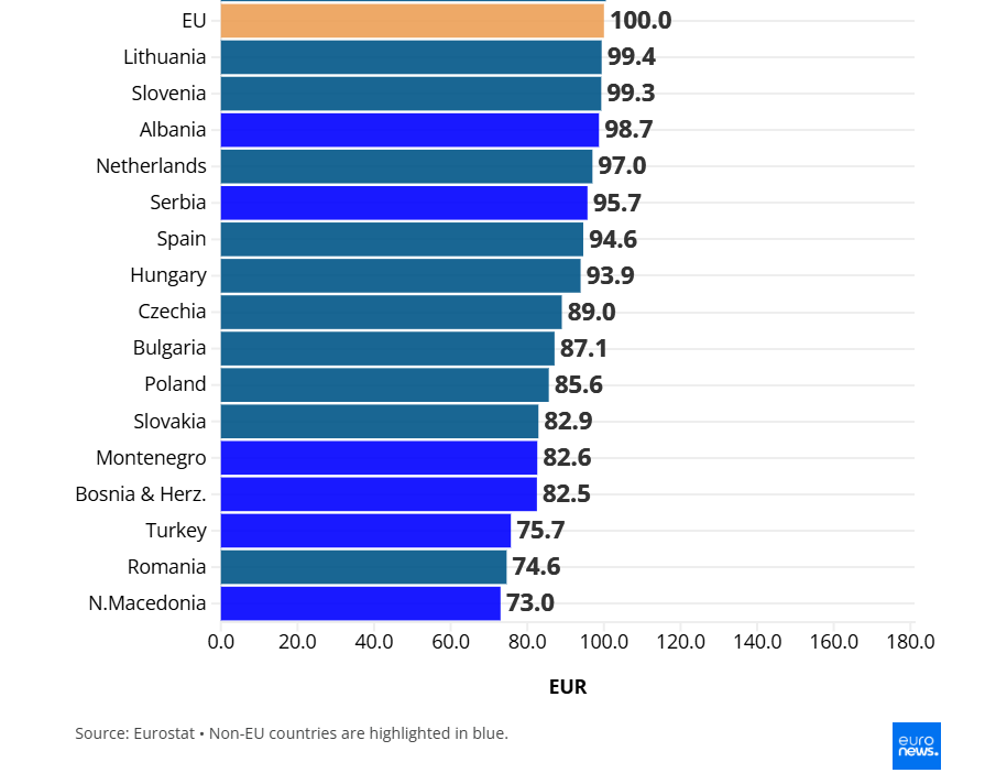 Srbija (95,7 eura) i Albanija (98,7) takođe su jeftinije od prosjeka EU.