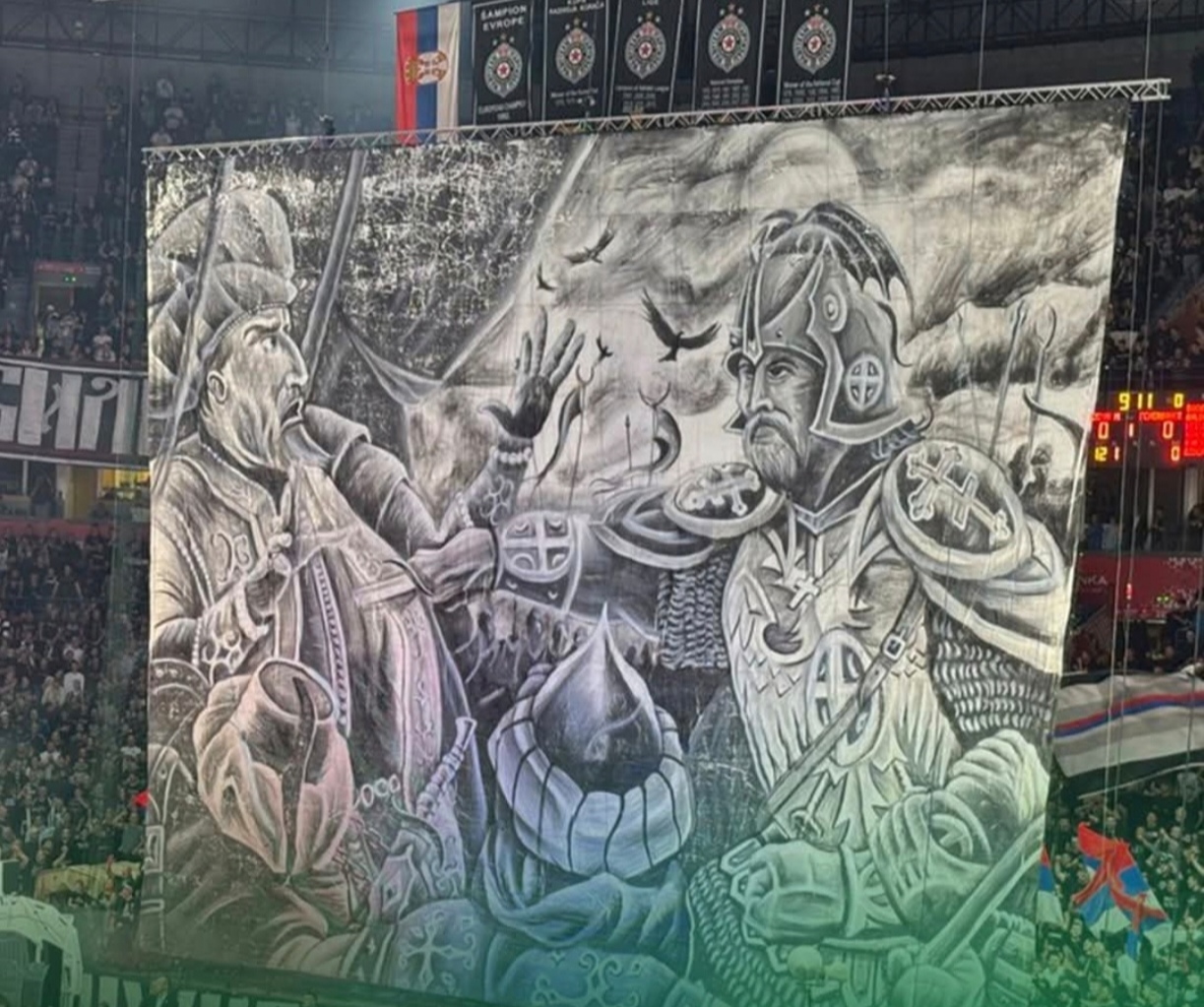 U utakmici 12. kola Evrolige u Beogradu postavljen je bio transparent koji je prikazivao kako Miloš Obilić ubija Murata u Kosovskom boju 1389. godine
