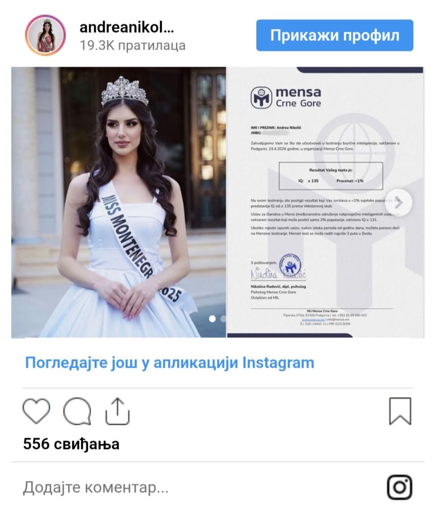Andrea Nikolić, aktuelna mis Crne Gore koja će sjutra veče u Bečićima predati krunu nasljednici u okviru zvaničnog izbora, pohvalila se na svom Instagram profilu da je postala članica Mense.