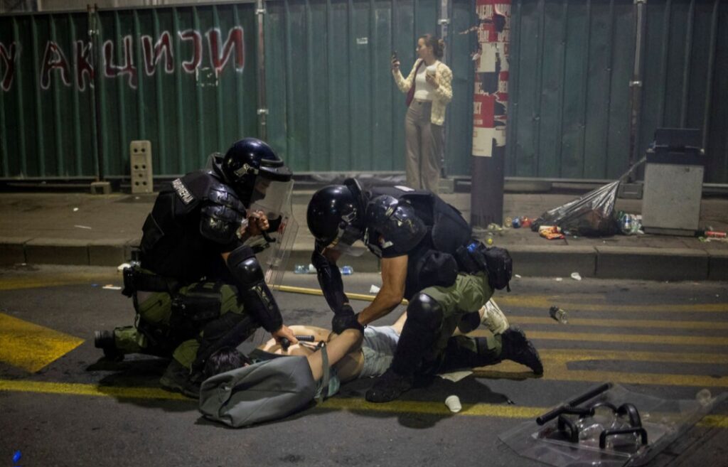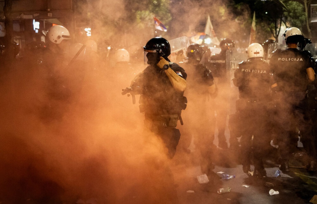 Kako prenose reporteri N1, ljudi sa maskama na licima i kapuljačama nasrnuli su na žandarmeriju, a čuju se i topovski udari.Ima građana koji su visoko podigli ruke, a pojedini građani stavili su gas maske.